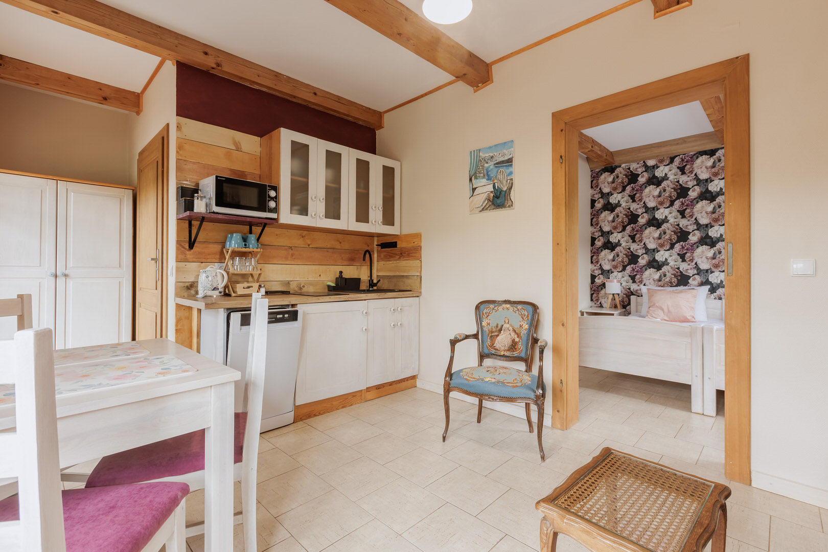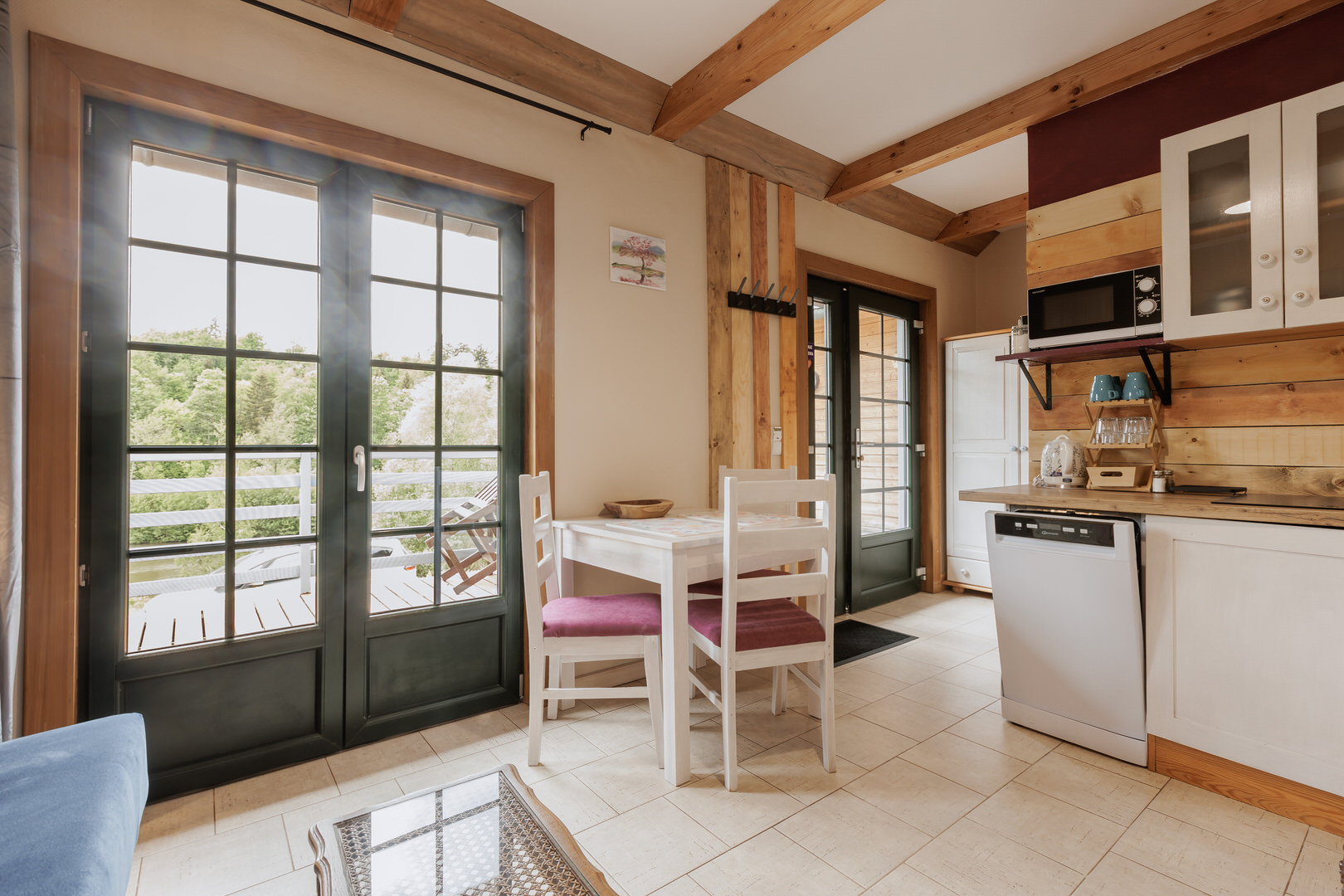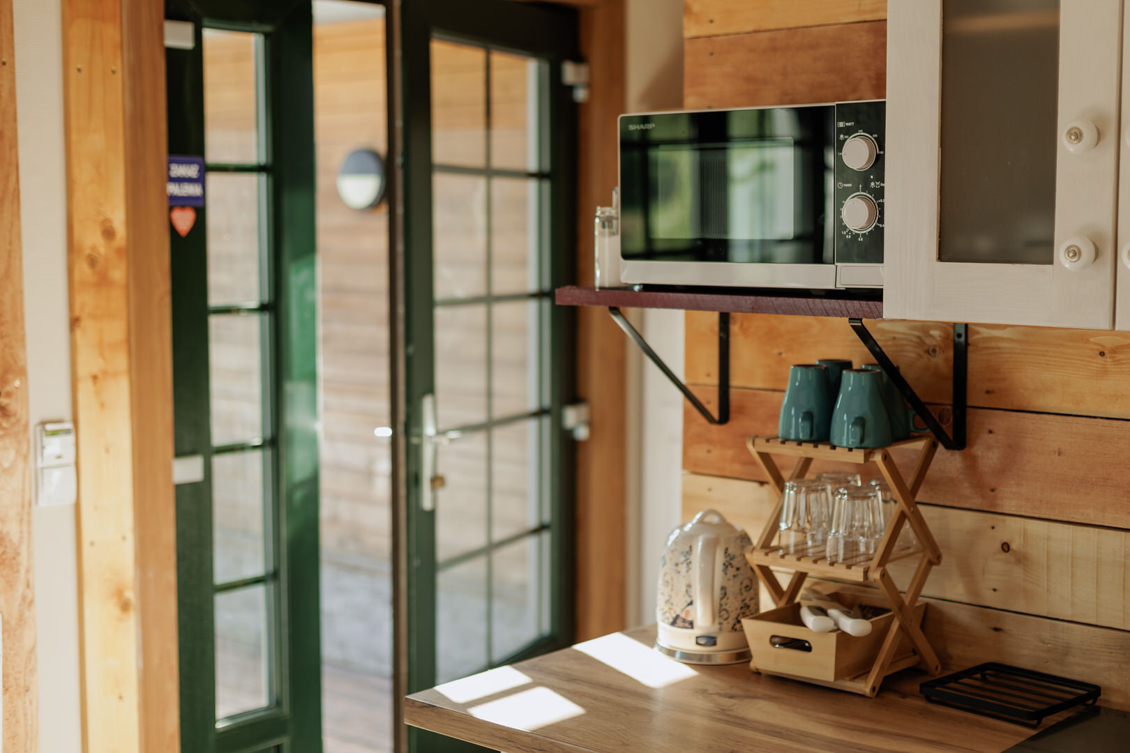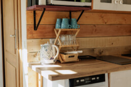 - aneks kuchenny z wyposażeniem (talerze, szklanki, sztućce)