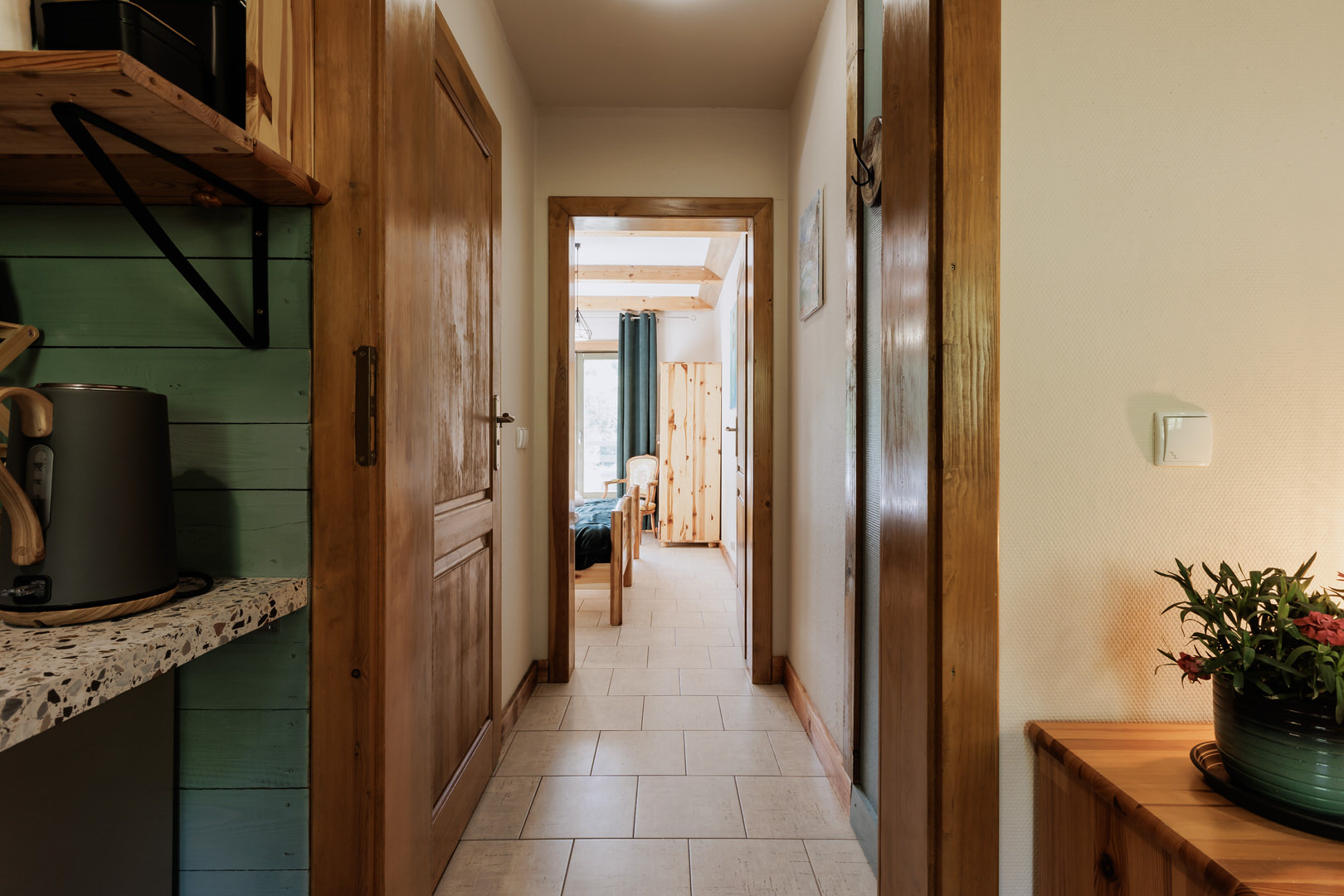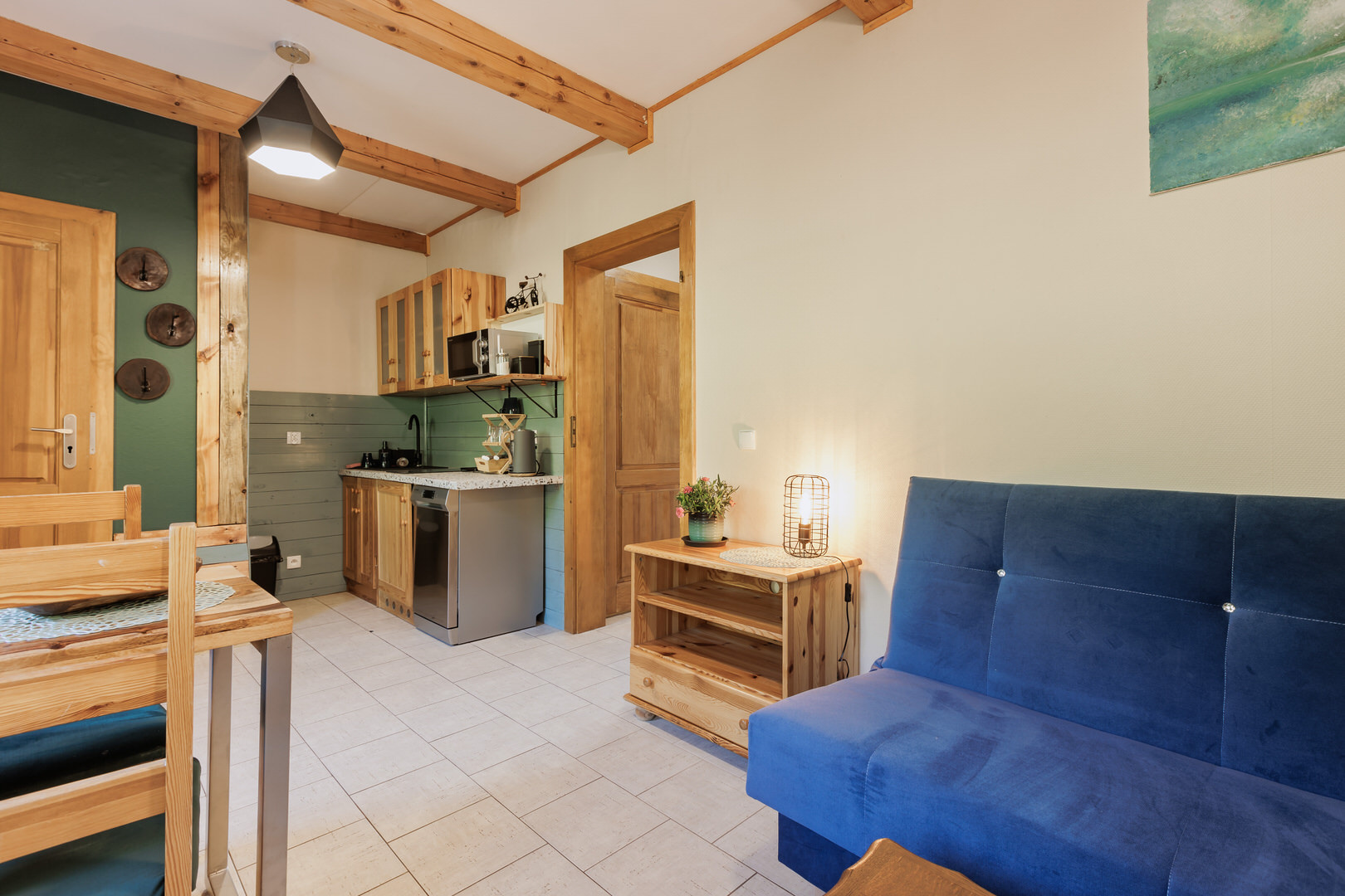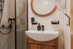 Apartament składa się z jednej sypialni z wygodnym, rozdzielnym łóżkiem dla dwóch osób, przestronnego pokoju dziennego z kanapą oraz aneksem kuchennym. Łazienka wyposażona jest w nowoczesny prysznic. Do apartamentu przynależy przytulny balkon, idealny na wieczorny odpoczynek przy lampce wina.